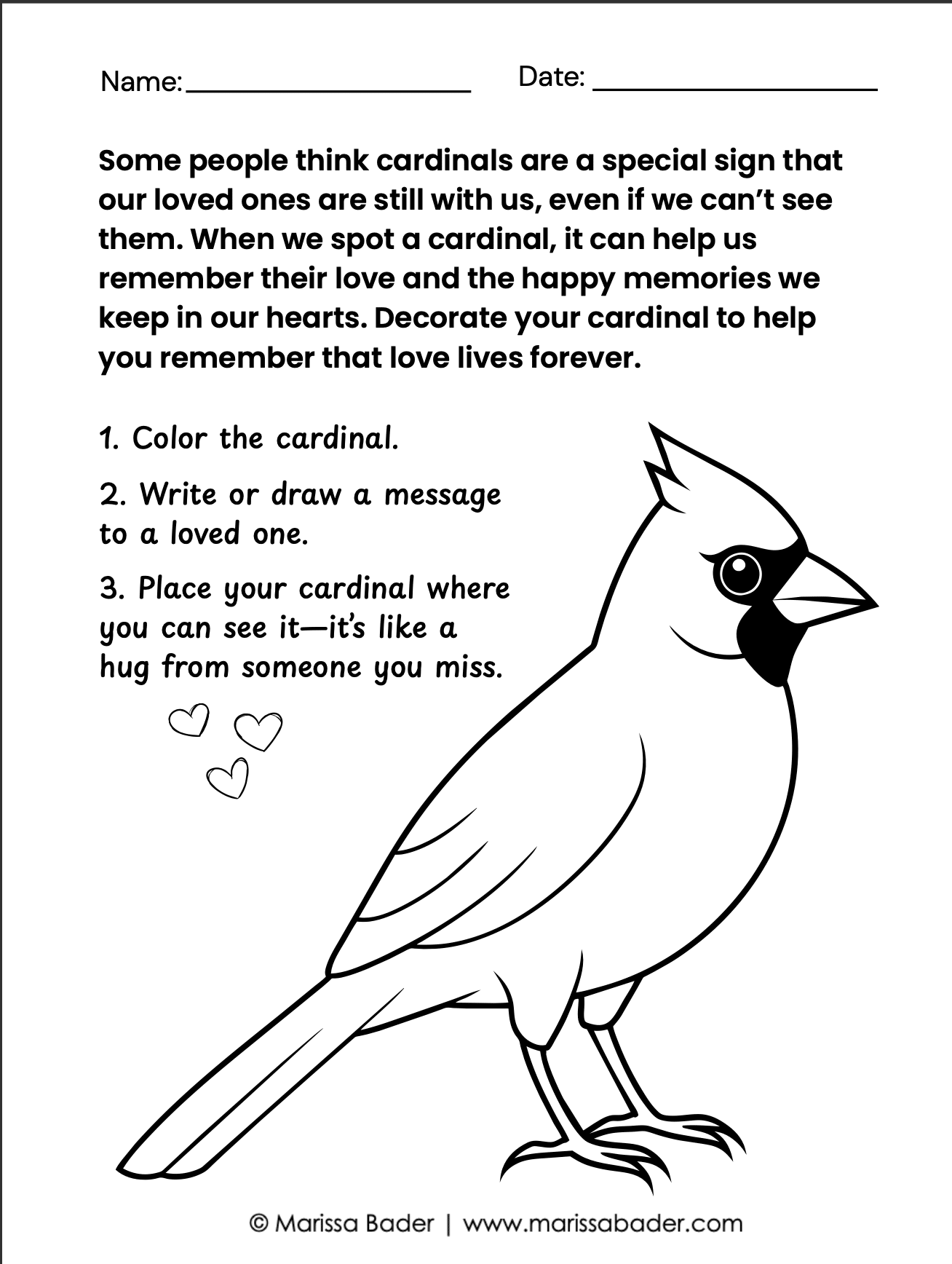 Download this free printable and let kids decorate their own cardinal as a way to honor and remember someone they love. Hang it in a place they see it often, as a way to remind them that love lives forever.